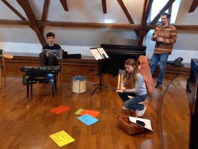 Im Laufe des Workshops durften auch alle Instrumentenkombinationen miteinander musizieren. Es gab keine Besetzungsvorgaben. Philipp Ossanna gab nur die Rahmenbedingung vor, dass auf den Instrumenten ‚feinfühlig‘ und aufmerksam mit ‚Ohren und Augen‘ zu spielen sei.