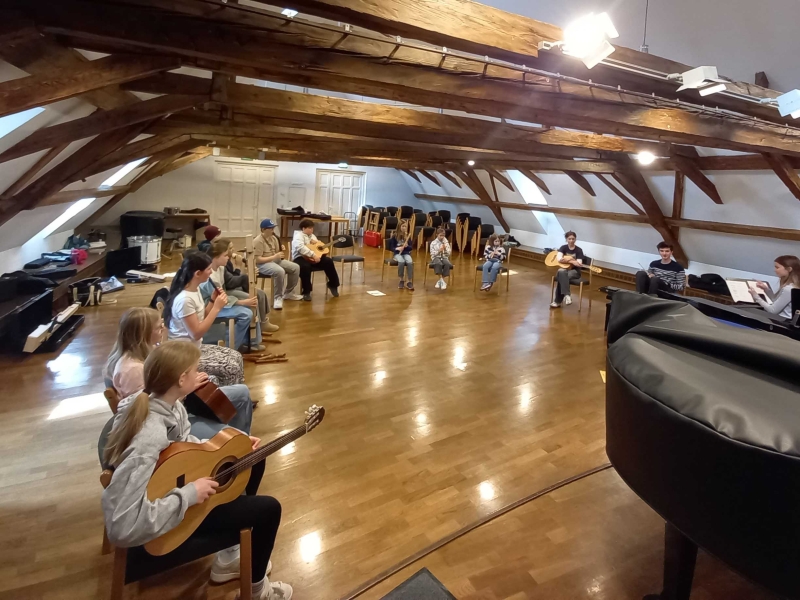 Nach ein paar Probedurchläufen durften auch die Schüler:innen die Dirigentenrolle übernehmen. Nach anfänglicher Schüchternheit wuchsen die jungen Dirigent:innen in die neue Aufgabe hinein und hatten richtig Spaß daran, immer wieder neue Varianten der Stücke kreieren zu können. Die ausführenden Musikant:innen waren alle hochkonzentriert bei der Sache und führten die gestellten Aufgaben der Jungdirigent:innen aus. Es wurde respektvoll miteinander musiziert. Niemand musste dabei Angst haben, etwas falsch zu machen.