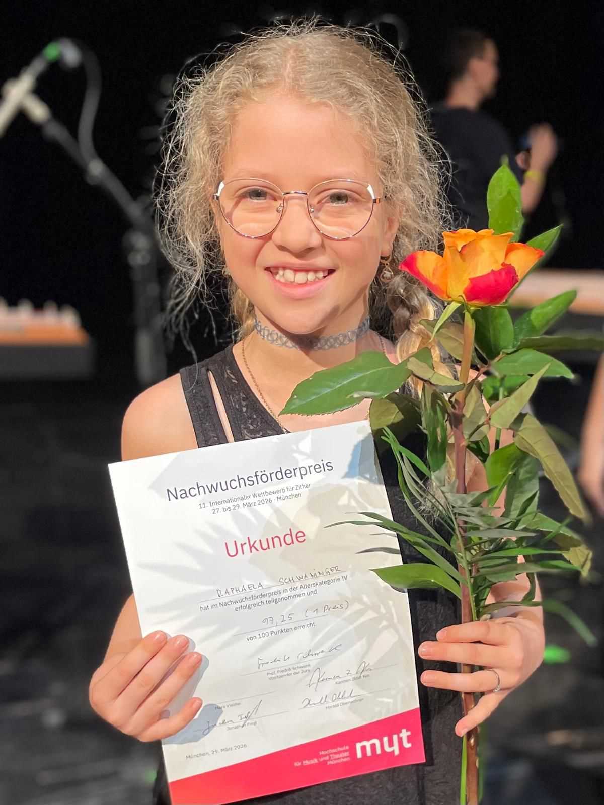Raphaela konnte sich beim Nachwuchsförderpreis, als einzige Teilnehmerin aus dem Land Österreich in der Alterskategorie IV (bis 9 Jahre), einen stolzen 1. Preis (97,25 von 100 Punkten) erspielen. Als Preisträgerin durfte sie auch im abschließenden Preisträgerkonzert, das in der Reaktorhalle stattfand, ein Stück ihres Wettbewerbsprogrammes zu Gehör bringen. Für die Schülerin Raphaela bedeutete dies zusätzlich eine große Anerkennung.