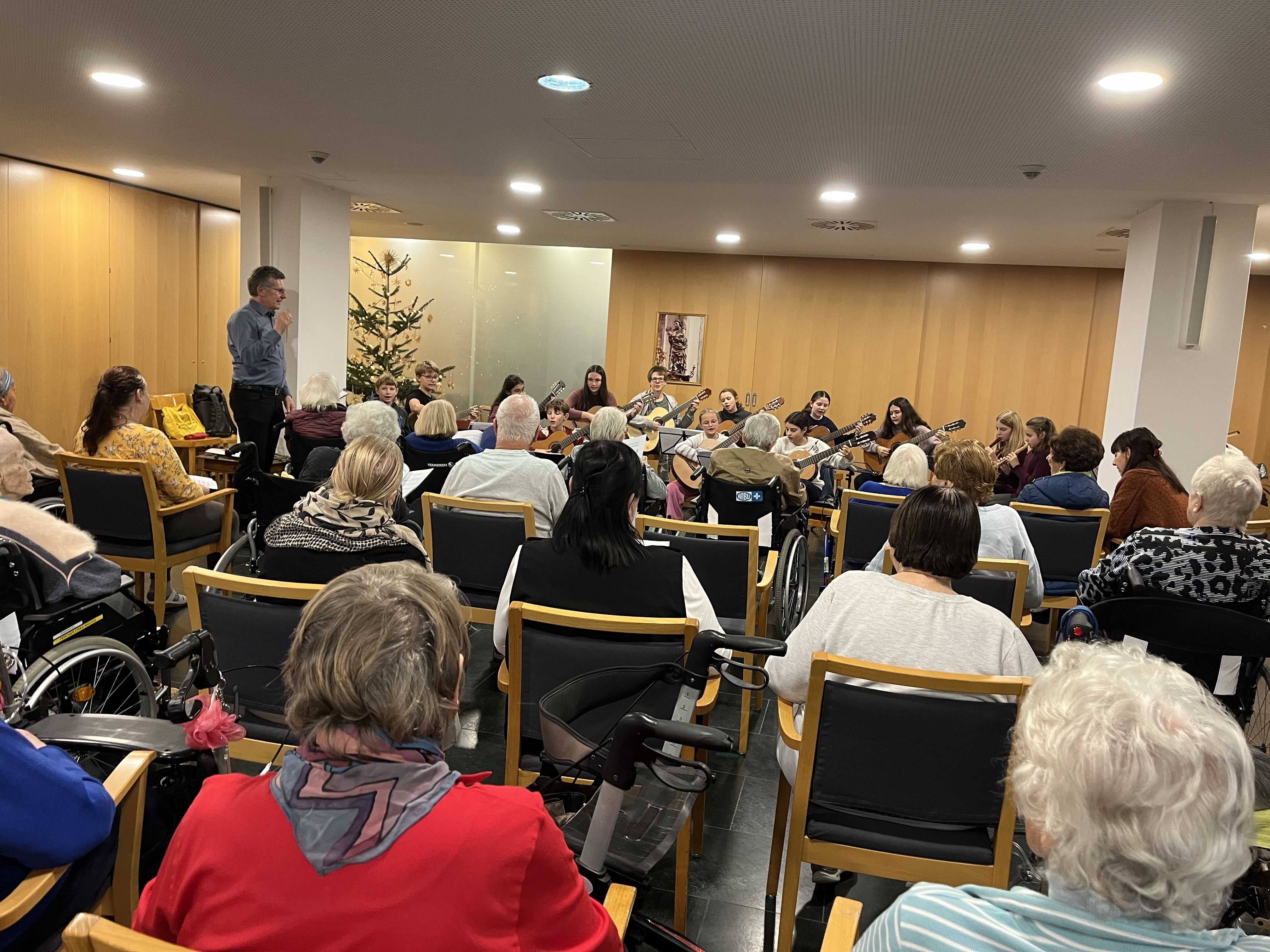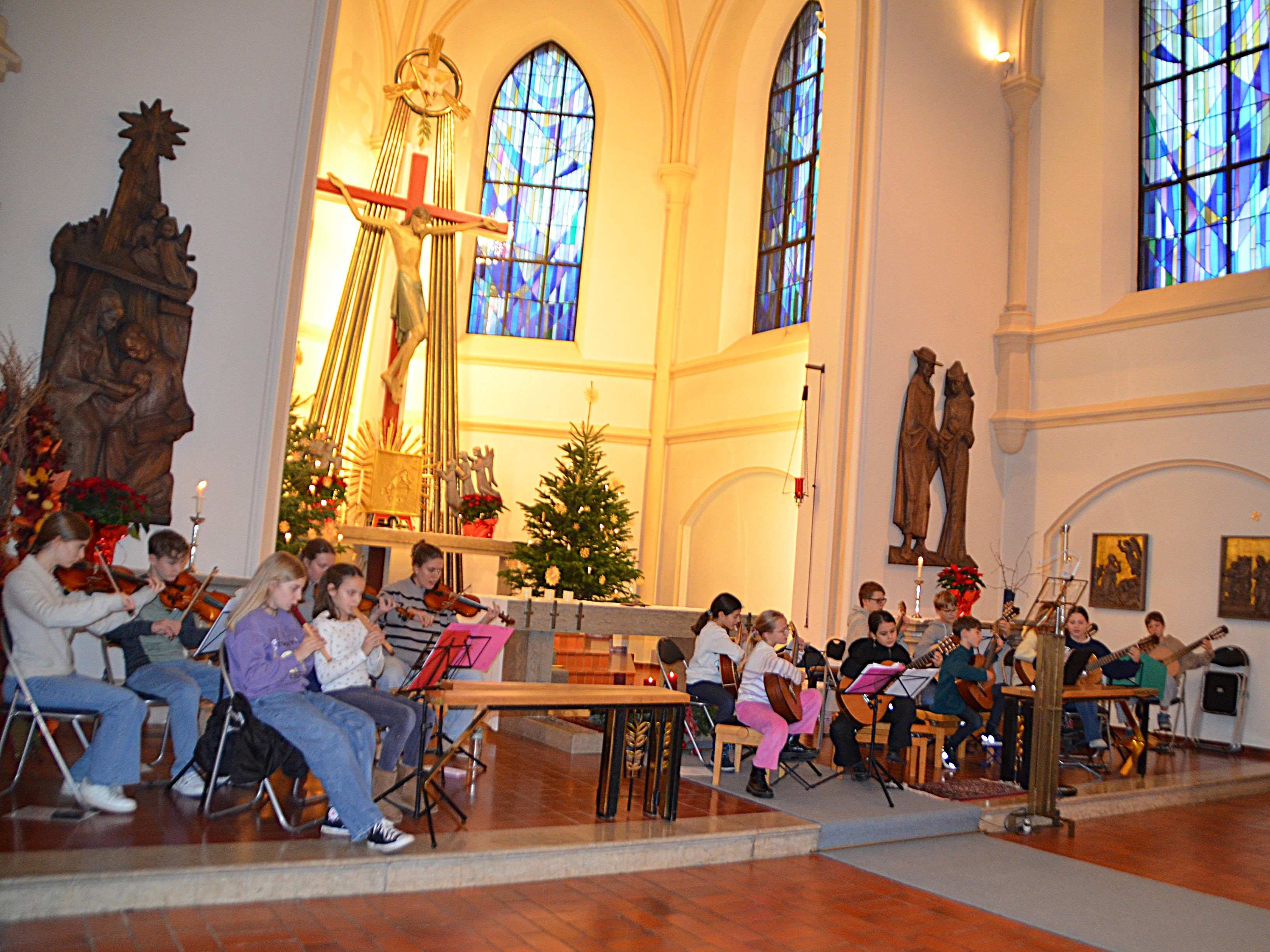 Schüler:innen aus den Violinklassen Ursula Sandbichler und Behruz Pietsch und aus der Blockflötenklasse Johanna Buchegger spielten Melodien der klassischen Weihnachtslieder, Gitarreschüler:innen aus meiner Klasse begleiteten und sangen mit Begeisterung dazu.